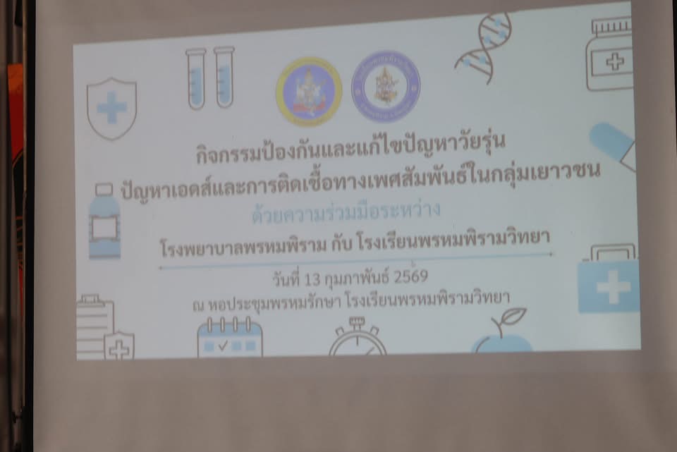 วันที่ 13 กุมภาพันธ์ 2569 นายประดับ กลิ่นขำ ประธานกรรมการสถานศึกษาขั้นพื้นฐาน พร้อมด้วย ดร.อดุล โตเขียว ผู้อำนวยการโรงเรียนพรหมพิรามวิทยา เป็นประธานกล่าวเปิดกิจกรรมป้องกันและแก้ไขปัญหาวัยรุ่น ปัญหาเอดส์ และการติดเชื้อทางเพศสัมพันธ์ของเยาวชน ตามโครงการติดตามและประเมินผลการดำเนินงานยุติปัญหาเอดส์ ระดับประเทศ โดยงานอนามัยโรงเรียนพรหมพิรามวิทยาร่วมกับโรงพยาบาลพรหมพิรามจัดกิจกรรมดังกล่าวฯ ซึ่งมีนักเรียนชั้นมัธยมศึกษาปีที่ 4/4, 4/6 และ 4/7 จำนวน 100 คน เป็นนักเรียนกลุ่มเป้าหมายในการเข้าร่วมกิจกรรมฯ ณ หอประชุมพรหมรักษา โรงเรียนพรหมพิรามวิทยา