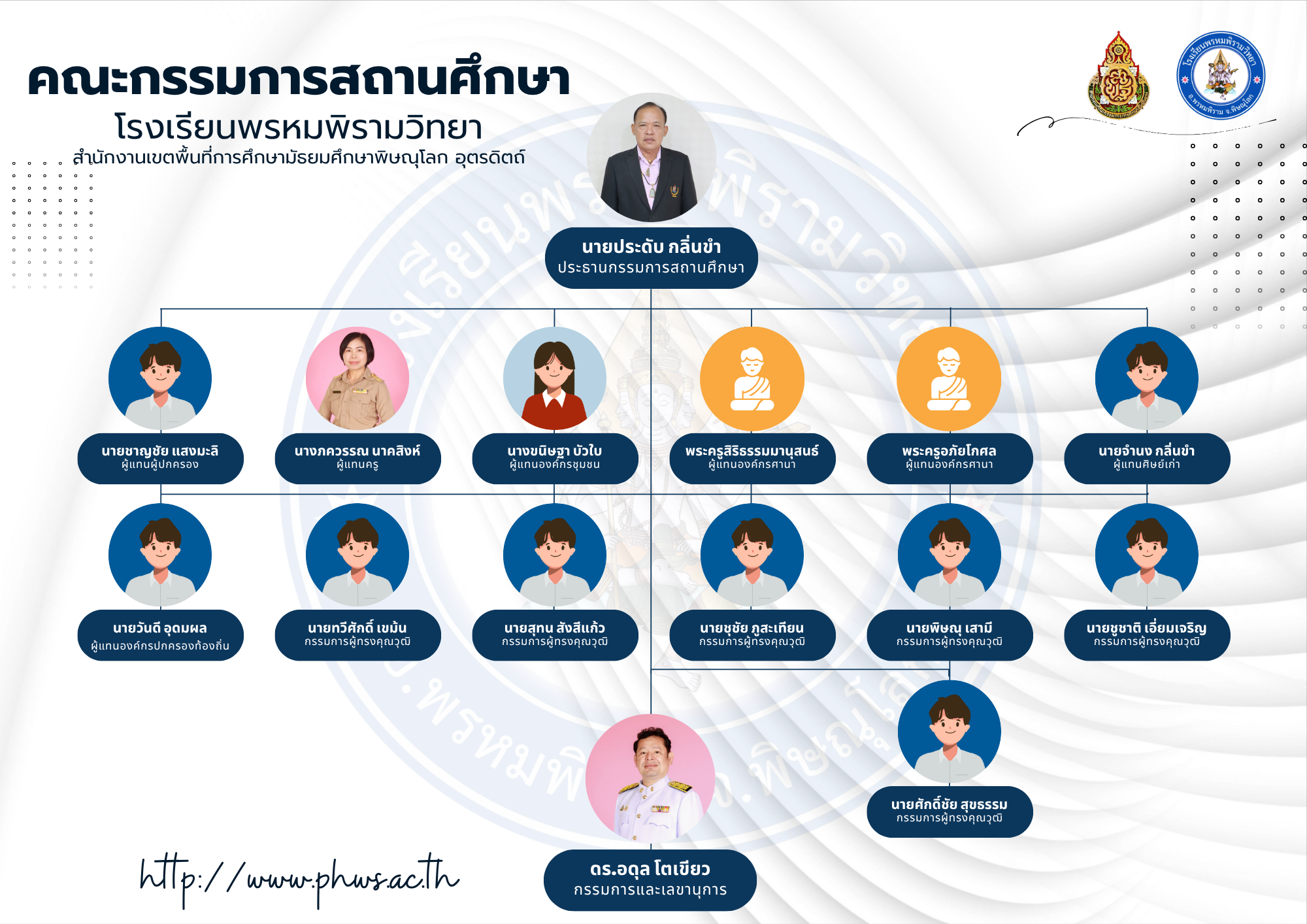 1. นายประดับ กลิ่นขำ    ประธานกรรมการสถานศึกษาขั้นพื้นฐาน โรงเรียนพรหมพิรามวิทยา